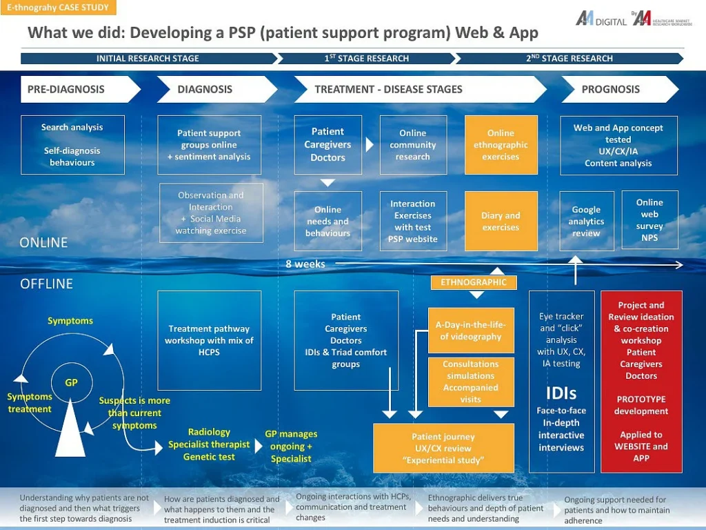 The client Pharmaceutical co. had tried to develop a PSP, however this was largely unsuccessful. There was little adoption of the website & App. Both doctors and patients did not interact with the site and after a recruitment drive and incentivisation, participants failed to return.