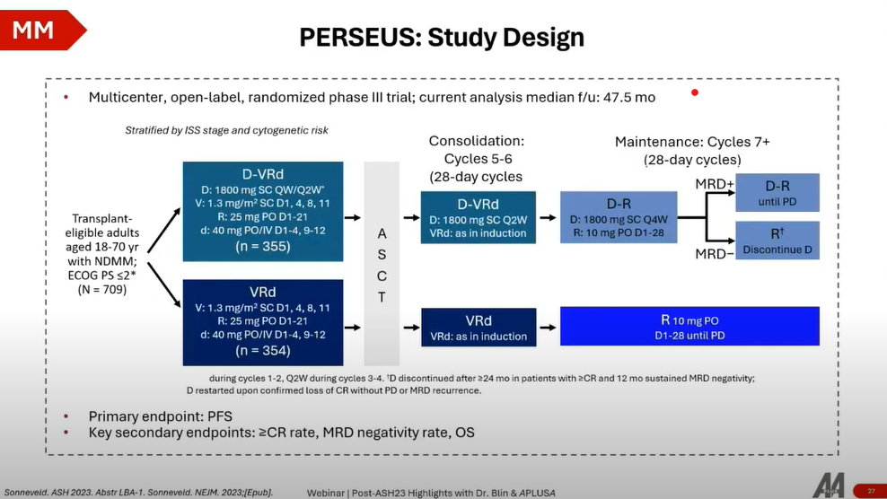 Pivotal Phase III PERSEUS Trial comparing D-VRd induction -> ASCT -> D-VRd consolidation -> D-R maintenance vs VRd induction -> ASCT -> VRd consolidation -> R maintenance in patients with transplant-eligible NDMM