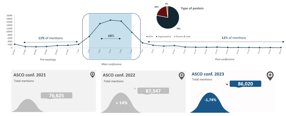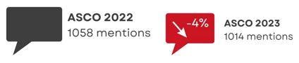 - The total number of mentions related to ASCO 2023 was down a mere 1,74% when compared to the 2022 edition going from 87k mentions to 86K mentions in 2023.
