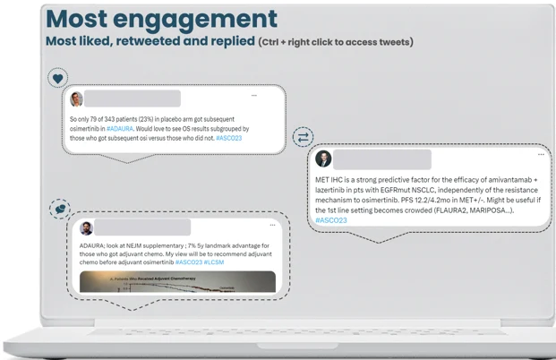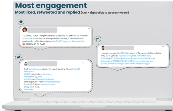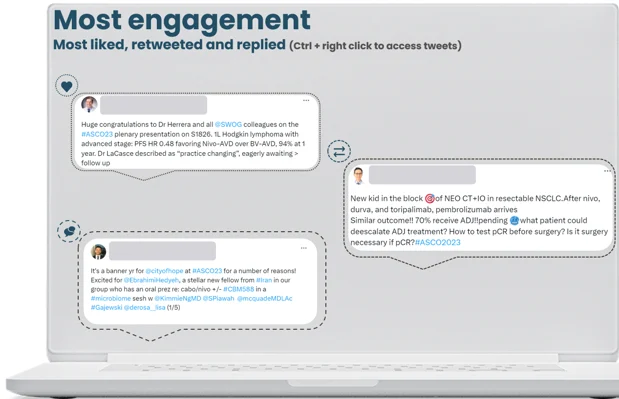 There was a slight decrease in overall mentions of 1,74% when compared to ASCO 2022, with HCPs representing the bulk of conversations at 78%. As usual, the peak of conversations happened during the conference, representing 68% of mentions recorded during the listening period.