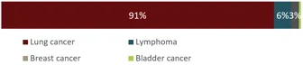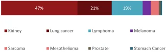 Note: Stomach, Carcinoma of unknown primary, Head and neck cancer, Esophageal, Bile duct cancer, Skin, Thymic, Blood cancers at less than 1%