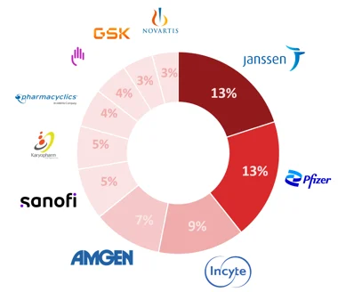 Janssen tops companies in volume of mentions. Incyte shows strong performance in terms of engagement.