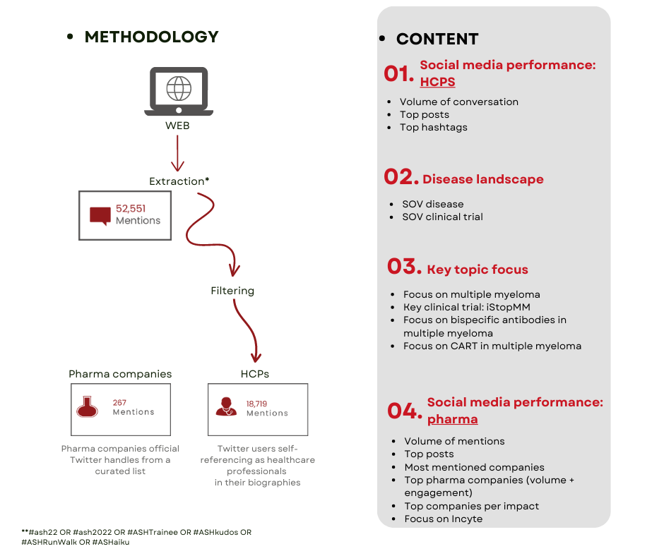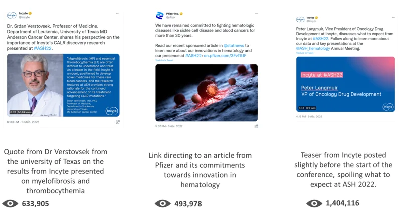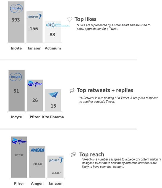 Despite a more contained social media presence during ASH2022, Incyte benefited from significantly more engagement on their published content. This engagement was mostly fuelled by the announcement of Incyte’s INCA033989, a new anti-mutant calreticulin (CALR)-targeted monoclonal antibody, for potential treatment in myelofibrosis and essential thrombocythemia.