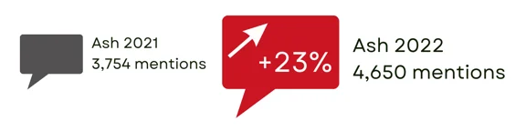 The official hashtag #ash22 was the most used one with the variation #ash2022 in second place. Note the use of specific hashtags such as #ashkudos and #ashtrainee corresponding with events organized by ASH during the conference.