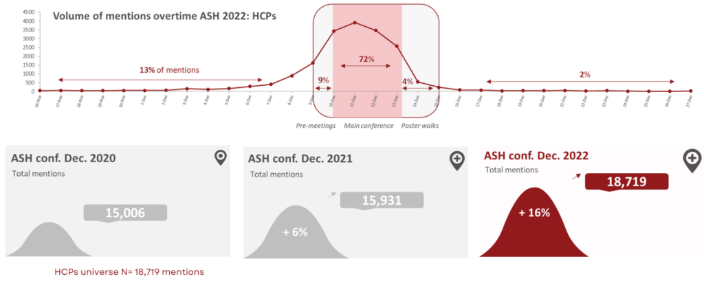 There was a 16% increase in HCPs mentions when compared to last year. As usual, the peak of conversations happened during the conference representing 72% of mentions recorded during the listening period.