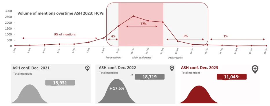 There were a total of 11K mentions from HCPs and 502 mentions around pharma companies recorded during the listening period from December 2nd, 2023, to December 19th, 2023 (two weeks before and one week after the conference).