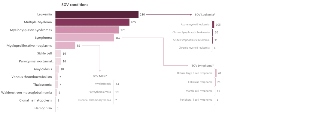 (# of mentions): acute myeloid leukemia, multiple myeloma and myelodysplastic syndromes dominated online discussions