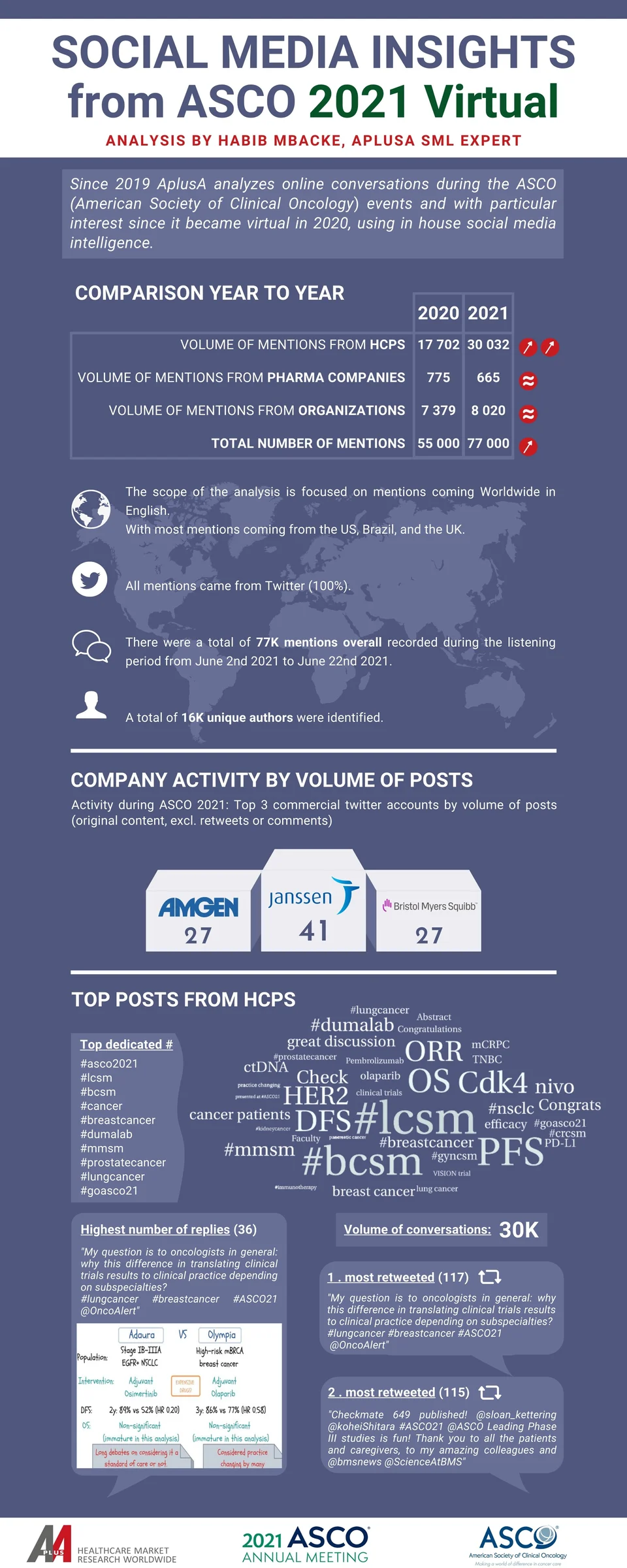 Since 2019 APLUSA analyzes online conversations during the ASCO events, particularly since it became virtual in 2020, using in-house social media intelligence. Last year, our social media intelligence analyst, Habib Mbacke, analyzed the conversations happening around the first 2020 virtual ASCO meeting.