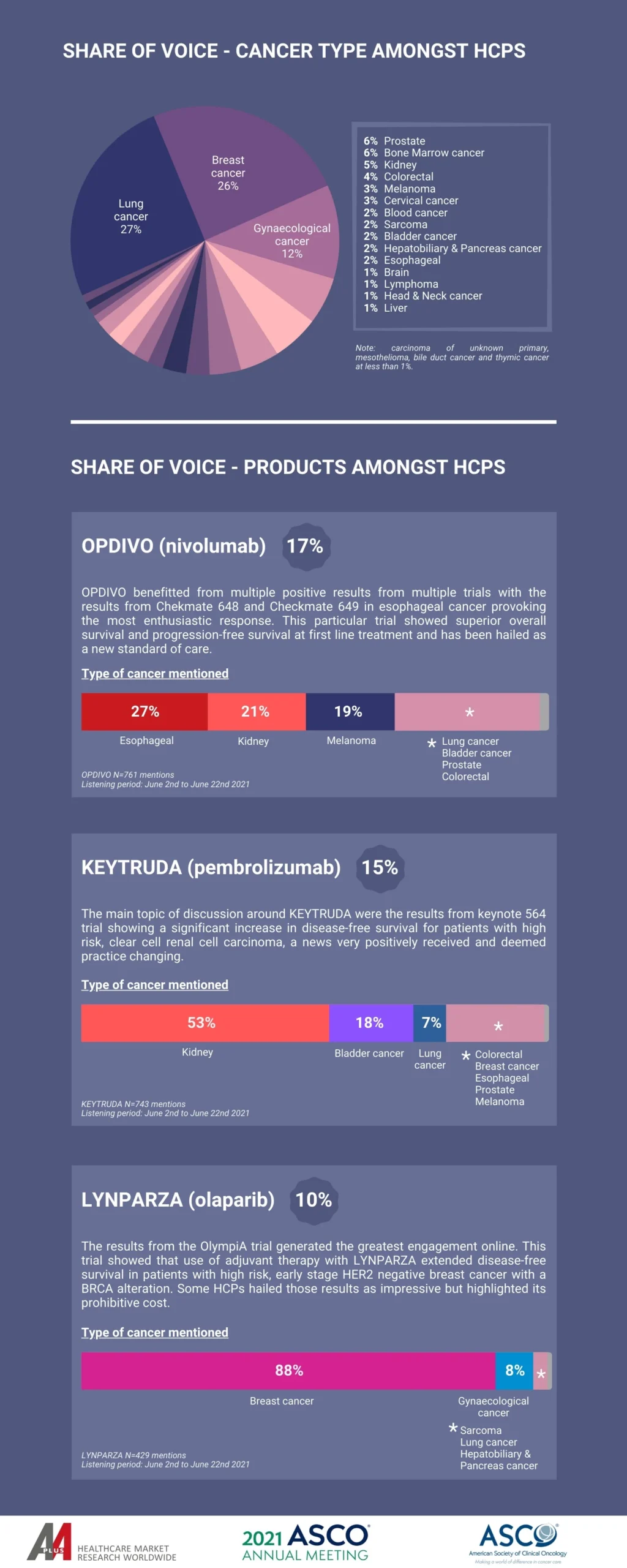 As with last year, lung and breast cancer remain the most discussed cancer type fuelled by encouraging results from multiple clinical trials in lung cancer. The most discussed trial was OlympiA in breast cancer (olaparib).