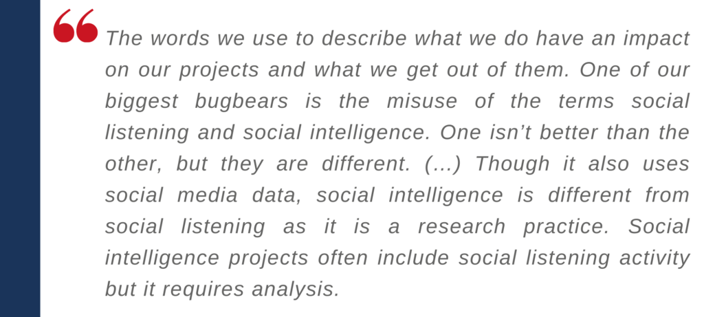 On the difference between social media listening and social media intelligence, Dr Jillian Ney2, founder of the Social Intelligence Lab sums it up nicely by noting: